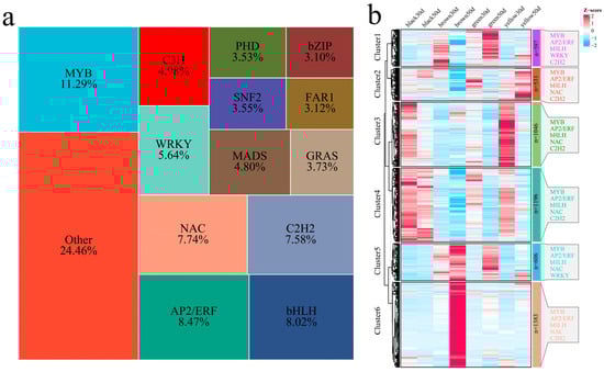 A total of 5359 TFs were identified among the 16,456 DEGs from different developmental periods of the same lines and the same developmental period of different lines, including mainly MYB, AP2/ERF, bHLH, NAC, C2H2, WRKY, C3H, MADS, GRAS, SNF2, PHD, FAR1, and bZIP (Figure 8a). The differentially expressed transcription factors were divided into six main clusters with different expression patterns through hierarchical clustering (Figure 8b). Cluster 1 included 597 TFs, with the highest expression levels in the brown 30 d and green 50 d groups, which included mainly MYB, AP2/ERF, bHLH, WRKY, and C2H2. Cluster 2 included 531 TFs, with the highest expression levels occurring at 50 d (green) and 50 d (yellow), which were mainly MYB, AP2/ERF, bHLH, NAC, and C2H2. Cluster 3 included 1046 TFs, with the highest expression levels in the black 30 d and yellow 30 d groups, which included mainly MYB, AP2/ERF, bHLH, NAC, and C2H2. Cluster 4 included 1196 TFs, with the highest expression levels in the 30 d and 50 d black plants; these genes included mainly MYB, AP2/ERF, bHLH, NAC, and C2H2. Cluster 5 included 606 TFs, with the highest expression levels in the brown 50 d and green 50 d groups, which included mainly MYB, AP2/ERF, bHLH, NAC, and WRKY genes. Cluster 6 included 1383 TFs, with the highest expression level in the brown 50 d group, mainly the iMYB, AP2/ERF, bHLH, NAC, and C2H2 genes.