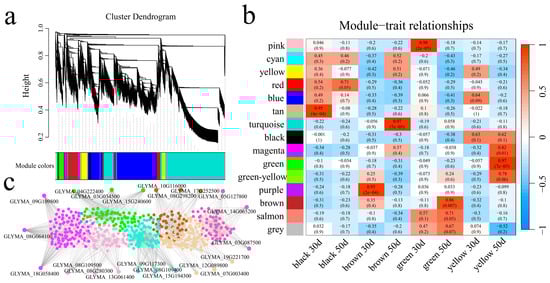 Weighted gene coexpression network analysis (WGCNA) was used to construct a coexpression network of 16,456 DEGs from different developmental periods of the same lines and the same developmental period of different lines related to soybean seed coat color (Table S3). The dynamic shear tree method was used to merge modules with similar expressions, and 15 coexpression modules were obtained, with different colors used to represent different modules (Figure 9a). According to the correlation results between modules and lines, the pink module was strongly correlated with the green color at 30 d, the tan module was strongly correlated with the black color at 30 d, the turquoise module was strongly correlated with the brown color at 50 d, the magenta and green modules were strongly correlated with the yellow color at 50 d, the purple module was strongly correlated with the brown color at 30 d, and the brown module was significantly highly correlated with the green color at 50 d (Figure 9b). Pink, tan, turquoise, magenta, green, purple, and brown were selected to construct the gene interaction network and identify the core genes (Figure 9c and Table S4). Three core genes were identified for each module, resulting in 21 core genes. These 21 core genes included six TFs (GLYMA_08G280300 (AP2/ERF), GLYMA_07G003400 (bHLH), GLYMA_19G221700 (WRKY), GLYMA_03G087500 (MYB), GLYMA_09G109800 (MADS), and GLYMA_08G298200 (MYB)), and three flavonoid pathway genes (GLYMA_08G109500 (CHS), GLYMA_08G109400 (CHS), and GLYMA_04G222400 (CHI)) (Table 2).