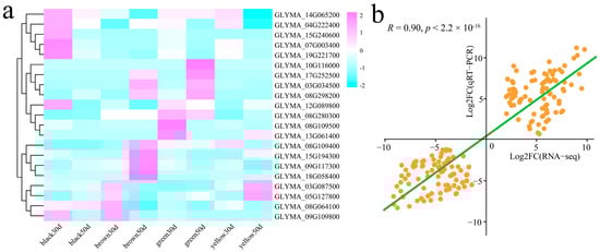 The expression patterns of these 21 candidates were detected via qRT–PCR (Figure 10a). Six genes (GLYMA_14G065200, GLYMA_04G222400, GLYMA_15G240600, GLYMA_07G003400, GLYMA_19G221700, and GLYMA_12G089800) were the most highly expressed genes at black 30 d. Four genes (GLYMA_10G116000, GLYMA_17G252500, GLYMA_03G034500, and GLYMA_08G298200) were the most highly expressed at brown 50 d and green 50 d. The expression of three genes (GLYMA_08G280300, GLYMA_08G109500, and GLYMA_13G061400) were greatest at green 30 d. The expression of four genes (GLYMA_08G109400, GLYMA_15G194300, GLYMA_09G117300, and GLYMA_18G058400) were the highest at brown 50 d. GLYMA_03G087500 and GLYMA_05G127800 presented the highest values at brown 30 d and yellow 50 d. GLYMA_08G064100 and GLYMA_09G109800 were the highest in the black 30 d and brown 30 d. In addition, the correlation between the qRT–PCR and RNA-seq fold changes for these 21 candidate genes involved in seed coat pigmentation was calculated. The results revealed that the RNA-seq data were significantly correlated with the qRT–PCR data (R = 0.90, p < 0.01), indicating that the RNA-seq data were reliable (Figure 10b).