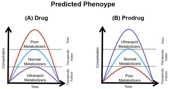 When an individual undergoes treatment with a drug, the target concentrations for the therapeutic effect are present before the metabolism that occurs to inactivate this substance. Thus, when an individual is a PM, there is a high probability of presenting adverse reactions since the drug will not be inactivated satisfactorily, so its plasma concentration will exceed the therapeutic range (Figure 1A). On the other hand, if an individual is a UM, the metabolism (and consequently inactivation) will be so fast that it will not reach the therapeutic range, and therefore, therapeutic failure is likely to occur. If the individual is treated with a prodrug, the target concentrations are those of the active metabolite, i.e., after the metabolism. PM individuals tend to have therapeutic failure because they do not generate sufficient concentrations of the active metabolite, while UM individuals may suffer adverse reactions because they produce increased concentrations of the active metabolites (Figure 1B). Therefore, through genetic testing, the predicted phenotype of an individual can be verified by predicting their metabolism rate, and in this way, the treatment can be personalized according to their peculiarities [].
