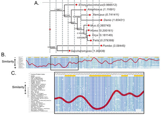 In our study, we aligned the sequences of the A34 protein from 10 species, ranging from yeast to humans, and constructed a phylogenetic tree to illustrate their evolutionary relationships (Figure 1A, Table 1) [24]. The analysis reveals a gradient of conservation across different taxa. In yeast species like Saccharomyces and Schizosaccharomyces pombe, A34 shows significant divergence, indicated by longer branch lengths, suggesting substantial evolutionary changes. In contrast, organisms like Xenopus and Danio (zebrafish) exhibit moderate conservation, while in mammals, including Mus (mouse), Felis, and Homo sapiens (human), A34 is highly conserved.