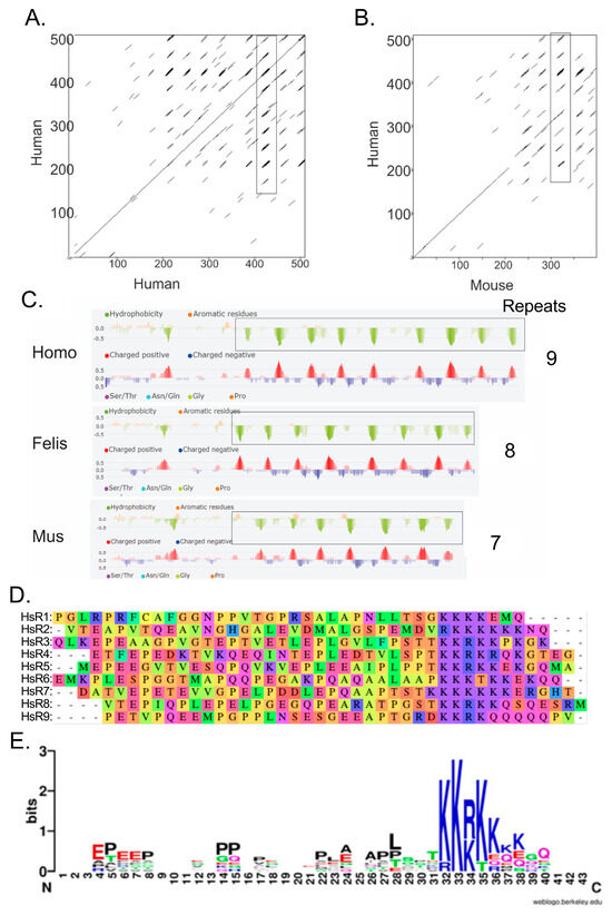 Examination of the hydropathy and charge plot of human, cat, and mouse A34 homologs (Figure 3C) revealed intriguing features in the CTD. The presence of recurring negative peaks and hydrophobic clusters again suggested the presence of repeated sequences. These regions rich in acidic residues and proline, characterized by negative charge, are followed by clusters of positively charged lysine residues. The number of lysines within these clusters varies significantly, ranging from just a few to more than five on average. Specifically, analyses using Dotmatcher and FELLS [26,27] confirmed the presence of repeated sequences within the A34 CTD (Figure 3A–C). A WebLogo analysis of all the aligned human A34 CTD repeats clearly reveals a distinctive pattern: a lysine cluster is consistently preceded by a long stretch of acidic residues interspersed with regularly spaced proline residues (Figure 3D,E) [29].
