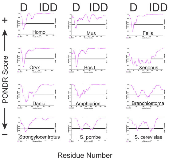 PONDR analysis of twelve eukaryotic A34 orthologs. The PONDR predictions were generated using the VSL2 algorithm (http://www.pondr.com/pondr-tut.html, accessed on 1 November 2024). A higher PONDR score is indicative of a tendency to disorder. D = dimerization domain; IDD = intrinsically disordered domain. The x axis represents the sequence residues, and the y axis is the PONDR score. The purple line is the PONDR predictions for each protein analyzed. The black horizontal line is the threshold between ordered (thin black line) and disordered (thick black line), with data above this line representing disorder. PONDR analyses were carried out with default settings.
