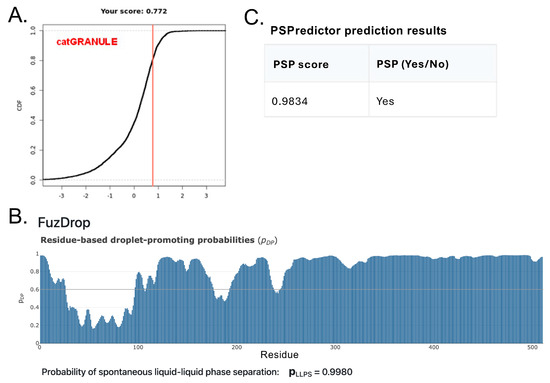- Hatos, A.; Tosatto, S.C.E.; Vendruscolo, M.; Fuxreiter, M. FuzDrop on AlphaFold: Visualizing the sequence-dependent propensity of liquid-liquid phase separation and aggregation of proteins. Nucleic Acids Res. 2022, 50, W337–W344. [Google Scholar] [CrossRef] [PubMed]