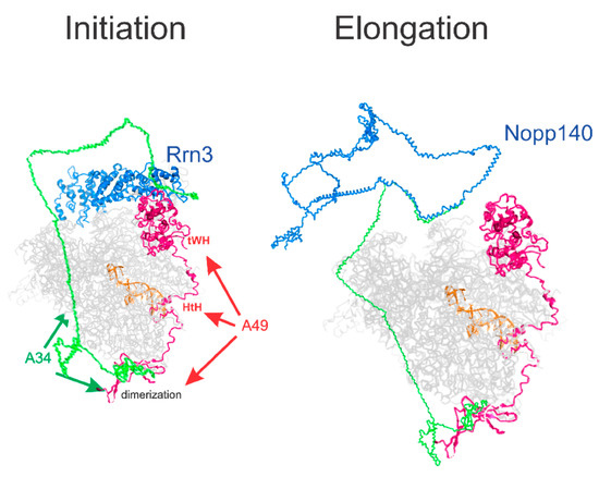 To explore this hypothesis, we utilized Robetta, a tool for protein structure prediction, to model the structure of human A34 in conjunction with the reported structure of RNA polymerase I (Figure 7). Although speculative, the resulting model aligns the known dimerization domains of A34 with those observed in existing cryo-EM images, while also proposing a potential role for the CTD in mediating further interactions with Rrn3, required for transcription initiation by Pol I [57] or other proteins involved in ribosome biogenesis, such as NOPP140 (Figure 7). This model is consistent with the findings that yeast A34 regulates the activity of yeast Rrn3 [12] but is not essential for rDNA transcription in yeast. However, mammalian PAF49 is essential for mammalian rDNA transcription. In our model, the A34/A49 heterodimer can stabilize the interaction of Rrn3 with the Pol I stalk. The yeast stalk consists of Rpa43 and Rpa14, while the mammalian Pol I stalk lacks Rpa14 [3,8,9]. It is formally possible that the yeast stalk binds Rrn3 more strongly than the mammalian stalk. Thus, additional interactions may be required to stabilize the Rrn3-Pol I complex, and this would be mediated by the mammalian A34/A49 heterodimer. Interestingly, this model places the CTD of A34 and its binding partner, NOPP140, circa the RNA exit tunnel formed by RPA1, RPA2, and the highly positively charged WH domain of RPA49 [3].