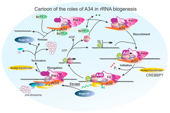 Additionally, we have found that SirT7, a deacetylase implicated in the regulation of ribosome biogenesis [58,59,60,61,62], interacts with A34. This interaction hints at a regulatory mechanism where SirT7 could deacetylate A34, potentially increasing the proportion of Pol I that associates with the A34/A49 heterodimer. Such a deacetylation event might enhance ribosome biogenesis by promoting a more stable and active Pol I complex, thereby facilitating efficient rRNA transcription. Figure 8 is a cartoon predicting the pos-translational modification(s) of A34 and summarizing the putative roles of A34 in rDNA transcription and pre-rRNA processing in coordination with the regulation of Rrn3 during the Pol I transcription cycle.