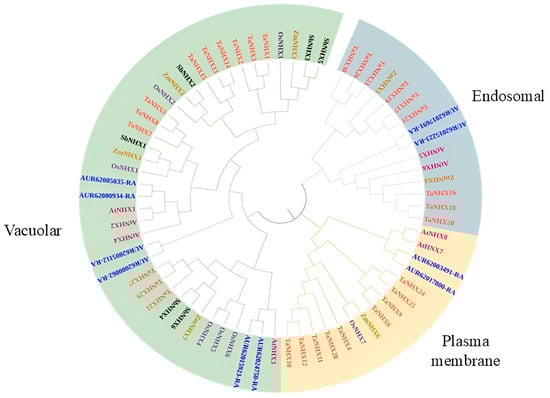 The NHX protein sequences of rice, maize, Arabidopsis, sorghum, and wheat were obtained from the literature [30,41]. The multiple sequence alignment was performed using the ClustalW, version 2.0 application, followed by converting the resultant file into MEGA format. The phylogenetic analysis was performed using MEGA11 (https://www.megasoftware.net/history (accessed on 16 January 2024), PHP) [57]. Furthermore, a circular evolutionary tree was created through a neighbor-end joining approach with 1000 bootstrap replicates and visualized using iTOL v6 [58].