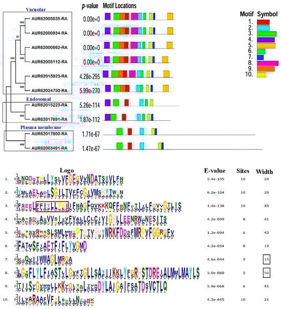 Based on the evolutionary relationships among the identified CqNHXs, motif patterns, and their gene architectures, the 10 NHXs were categorized under three subfamilies. The proteins AUR62005035-RA, AUR62000934-RA, AUR62000862-RA, AUR62005112-RA, AUR62015923-RA, and AUR62024750-RA were placed under the vacuolar subfamily. The plasma membrane subfamily consisted of AUR62017800-RA and AUR62003491-RA and the endosomal subfamily of AUR62015223-RA and AUR62017691-RA (Figure 2). The MEME 5.5.0 software examined the motif distribution to understand the structure-based classification of the CqNHXs, predicting 10 putative motifs with amino-acid lengths ranging from 6 to 50 (Figure 2).