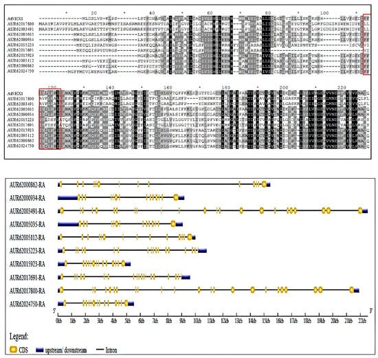 A comparable motif arrangement was seen in the proteins that belonged to the same category. Of the 10 motifs, 2, 3, and 10 were present in all the 10 NHXs of quinoa. All 10 motifs were predicted in almost all Vac NHXs except AUR62024750-RA, which was devoid of motif 8. Motifs 4 and 6 were located in both the Vac and PM subfamilies. Motifs 9 and 5 were particular to the Vac subfamily, providing evidence for the potential loss of protein sequences during evolution. Also, the proteins under the PM subfamily showed five identical motif numbers. The Endo NHXs AUR62015223-RA and AUR62017691-RA displayed six and seven motifs, respectively. The analysis also showed that motif 8 was the largest, having 50 amino acids, and motif 7 was the smallest, having only 15 amino acids. Additionally, motif 3 was observed to have a conserved region, “FFIYLLPPI,” which was present in all 10 NHX proteins of quinoa. Amiloride, an inhibitor of NHXs, has a stronger affinity for this region. The distribution of this conserved site was again analyzed through multiple sequence alignments performed using the GeneDoc web tool. Here, the sequence “FFIYLLPPI” was presented by the Vac NHXs only (Figure 3). Also, the location of the amiloride binding site was observed to be relatively conserved among these six NHXs with its positioning at the N-terminus. To learn more about the evolutionary history of the CqNHXs, their gene structure and exon distributions were identified. Exon/intron structural heterogeneity, an essential component of gene family evolution, adds more proof to support phylogenetic classifications. The number of exons and introns in the structures of genes from the same lineage was comparable. The upstream and downstream regions were noticeably present in all the 10 CqNHXs. The PM-localized NHX genes exhibited more exons (23), followed by the Endo NHXs with 20 exons. Meanwhile, the Vac genes show a comparatively smaller number of exons (14) (Figure 3).