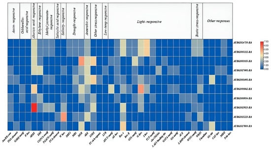 Representation of cis-acting regulatory elements present in 1500 bp upstream of CqNHX promoters. The functional distribution of each cis-acting elements is presented at the top. The scale of abundance is shown on the right-hand side, with a dark red color and dark blue color indicating the higher and lower abundance of cis-acting elements, respectively.