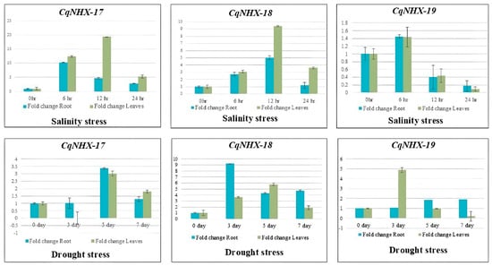Relative expression levels of CqNHX genes in leaves and roots of Chenopodium quinoa in response to salt stress for 0, 6, 12, and 24 h and drought stress for 0, 3, 5, and 7 days. The y-axis and x-axis represent the fold change and treatment periods, respectively. Error bars indicate standard error of CT means of NHX genes.