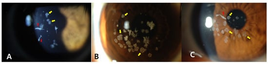 - Holland, E.J.; Daya, S.M.; Stone, E.M.; Folberg, R.; Dobler, A.A.; Cameron, J.D.; Doughman, D.J. Avellino corneal dystrophy. Clinical manifestations and natural history. Ophthalmology 1992, 99, 1564–1568. [Google Scholar] [CrossRef]