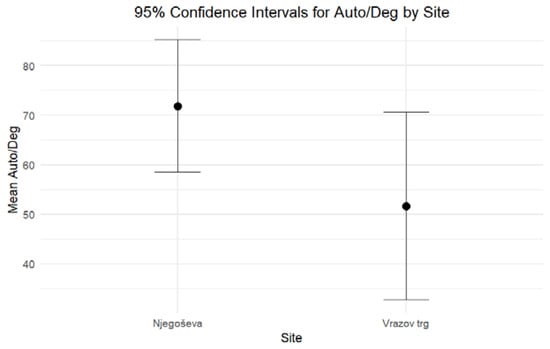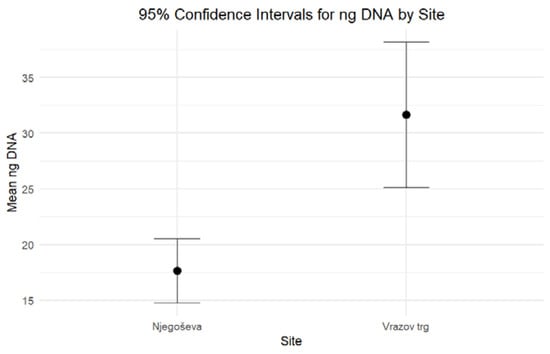 When comparing the DNA yield and the degree of DNA degradation for petrous bones excavated from Ljubljana’s archaeological sites of Vrazov trg and Njegoševa, two hypotheses were tested to evaluate whether the two parameters exhibit any statistically significant differences. Based on the combined results of the independent-sample median test and confidence intervals, both formulated hypotheses should be rejected. The results of nonparametric statistic testing showed significant differences (p < 0.001) in the DNA yield, while the differences in the Auto/Deg ratio were borderline significant (p = 0.053). Petrous bones from Vrazov trg yielded more DNA (Mean = 31.64, Standard Error = 3.22) compared to those from Njegoševa (Mean = 17.66, Standard Error = 1.44) (Figure 1). The Auto/Deg ratio was higher in petrous bones from Njegoševa (Mean = 71.84, Standard Error = 6.73) when compared to those from Vrazov trg (Mean = 51.68, Standard Error = 9.33), showing the difference in DNA degradation between samples from previously mentioned sites (Figure 2). Descriptive statistics, test statistics, and tests for the normality of the distribution of the DNA yield and the degradation ratio can be seen in SM S2 (Tables S1–S3).