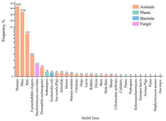 It is worth noting the popularity of nematode C. elegans (181 publications) and yeast S. cerevisiae (101 publications) models and their important role in exploring the fundamental mechanisms of aging. These simple organisms enable investigating basic cellular processes at the molecular level. Their use complements research on more complex organisms, such as mice and rats. As can be seen from Figure 1, most of the selected MeSH terms have a more common or generic name of the model organism. Next, we selected the most popular species for each term, based on the list of the most representative species provided by Uniprot (https://www.uniprot.org/uniprotkb/statistics, accessed on 20 September 2024).