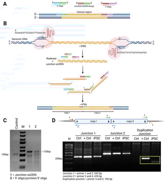 Schematic representation of genome editing to create the chromosome 4 duplication. (A) Representation for designed guide RNAs, bridging oligos for the 5′ site (blue section is the adaptor sequence and green section targets the 5’ end of the duplicated region), new desired junction site (red section targets the 3’ end of the duplicated region and green section targets the 5’ end of the duplicated region), and 3′ site (red section targets the 3’ end of the duplicated region and pink corresponds to adaptor sequence). (B) Schematic diagram of possible binding of the 5′ oligo, 3′ oligo and desired new junction, after which a new DNA strand is synthesized. Figure created with BioRender.com. (C) Pooled genotyping via PCR using primers for the new anticipated junction using junction ssODN oligo alone or 5′, junction and 3′ oligos. (D) End point PCR from control individual (no chromosome 4 duplication or strabismus, Ctrl), positive control (strabismic patient with presence of chromosome 4 duplication, +Ctrl), and selected edited iPSC sub-line (iPSC) testing for 5′ junction (Junction 1), 3′ junction (Junction 2) (to ensure no inversion) and new junction for duplication. The duplication junction in the iPSC line is slightly smaller than in the positive control individual because the iPSC duplication is 50 bp smaller than the originally identified duplication due to limitations in the design of the guide RNAs.