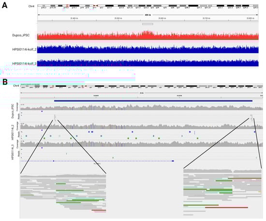 To ensure a uniform genetic background, an early passage of the KOLF2.1J line [] was used to insert the chromosome 4 duplication using a CRISPR technique with bridging oligos. The nucleofection method for the delivery of Cas9 RNP and ssODN was performed as described []. Since it is a 23 kb duplication, three different bridging oligos were designed flanking the 5′ site, new junction, and 3′ site (Figure 1A). Two guide RNAs were designed to cut at the 5′ and 3′ breakpoints (Figure 1B) and two different approaches were attempted to insert the duplication, one with the addition of the three bridging oligos and one including just the bridging oligo for the novel junction. Pooled genotyping via PCR for the new anticipated junction yielded the strongest evidence for the formation of the duplication using the bridging oligo alone (Figure 1C). After screening 96 individual clones, a single clone with the novel junctional sequence was found. This clone was further subcloned and six sub-lines were then genotyped by ddPCR, showing a copy number of 3. PCR was used to ensure the selected line had the new junction, the original 5′ and 3′ junctions (to ensure no inversion), and did not have the junction that would be created if a deletion occurred (Figure 1D). Due to limitations in the design of the guide RNAs, the resultant duplication is ~50 bp smaller than the duplication found in patients (Figure 1D). Once the presence of the duplication was confirmed, whole-genome sequencing was performed in the new line and compared with the parental line to ensure no other CNVs or SNVs were created during genome editing. Whole-genome sequencing showed a gain in read coverage in the duplicated region (Figure 2A), and split reads that correspond to the new junction were identified only in the edited line at the breakpoints of the duplication (Figure 2B). The analysis shows that the process of inserting the chromosome 4 duplication did not create any additional variants in the new line.