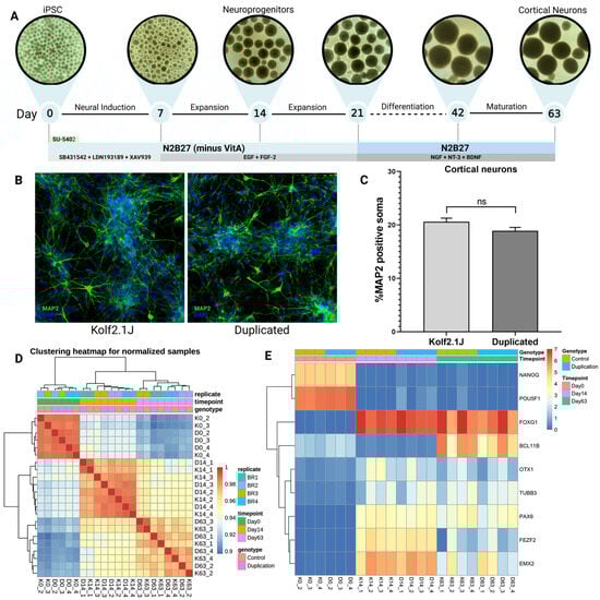 Schematic differentiation and validation of generated cortical neurons. (A) Schematic overview of the cortical neuron differentiation method, from day 0 to day 63. Figure created with BioRender.com. (B) Cortical neurons were dissociated at day 63 and immunocytochemical staining for MAP2 was performed 14 days after dissociation, in the control line (Kolf2.1J) and cells with chromosome 4 duplication (duplicated). (C) Quantification of MAP2 positive soma in control line (Kolf2.1J) and cells with duplication (duplicated); t-test was performed. (D) Quality control clustering heatmap from iPSCs, neuroprogenitor cells and cortical neurons at days 0 (three replicates), 14 and 63, respectively (four replicates), for control cells (K) and cells with duplication (D). (E) Heatmap for stem cell marker and neuronal marker expression using log2(FPKM + 1) values, comparing iPSCs (day 0), neuroprogenitor cells (day 14) and differentiated cortical neurons (day 63).