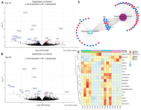 PPIEL and KCNK9 are both found in imprinted regions, and disruptions of imprinting are associated with neuropsychiatric disorders [,]. Several lncRNAs are differentially expressed, including LINC01139, which has been implicated in several cancers, including glioma []. NEUROD4 is a basic helix–loop–helix transcription factor important in neurogenesis [] that is upregulated in neuroprogenitors with the duplication. Several other transcription factors are also dysregulated, including POU5F1, POU2F2, and several zinc finger transcription factors. Multiple other genes are differentially expressed, many of unknown function.