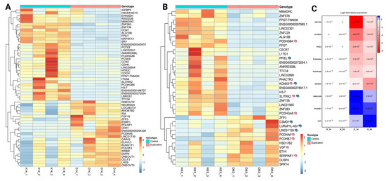 Heatmap of the DEGs in neuroprogenitors (A) and cortical neurons (B) and validation by qPCR (C). (A) Heatmap showing the expressions (z-scores) of differentially expressed genes in neuroprogenitor cells between controls and cells with duplication (fourth independent differentiations). (B) Heatmap showing the expressions (z-scores) of differentially expressed genes in cortical neurons between controls and cells with duplication, a pink brain next to the gene name represents a neuronal/synapse related function and a blue brain next to the gene name represents genes associated with neurodevelopmental disorders. (C) qRT-PCR validation from randomly selected upregulated and downregulated genes; total RNA from genotypes at day 14 and day 63 was used to analyze expression levels, and data were normalized using TBP as the reference gene.
