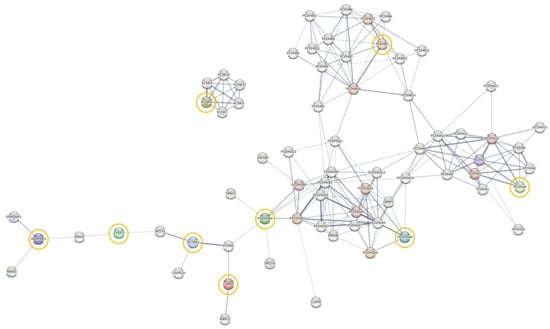 Protein–protein interaction (PPI) network of the DEGs in cortical neurons. The PPI interaction network of 9 relevant mapped neuronal function-related DEGs at day 63, constructed in the STRING database (DEGs highlighted in yellow circles).