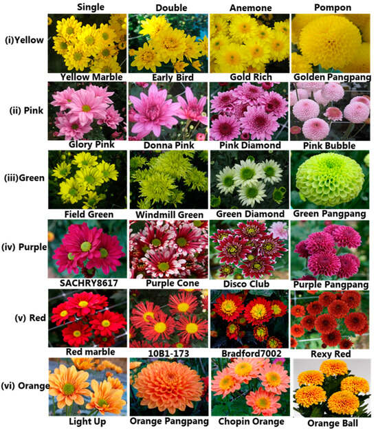 Spray type chrysanthemum cultivars representing various floral types and colors used in this study. (i) Yellow cultivars—Yellow Marble (Single (S)), Early Bird (Double (D)), Gold Rich (Anemone (A)), and Golden Pangpang (Pompon (P)); (ii) Pink cultivars—Glory Pink (S), Donna Pink (D), Pink Diamond (A), and Pink Bubble (P); (iii) Green Cultivars—Field Green (S), Windmill Green (D), Green Diamond (A), and Green Pangpang (P); (iv) Purple Cultivars—SACHRY8617 (S), Purple Cone (D), Disco Club (A), and Purple Pangpang (P); (v) Red cultivars—Red Marble (S), 10B1-173 (D), Bradford (A), and Rexy Red (P); and (vi) Orange Cultivars—Light Up (S), Orange Pangpang (D), Chopin Orange (A), and Orange Ball (P).