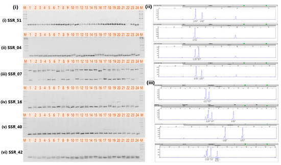 Representative images of (i) PCR amplicons of six SSR markers tested and separated on agarose gel; and (ii & iii) chromatograms of SSR_51 and SSR_16 in different samples by ABI genetic analyzer 3100xl.