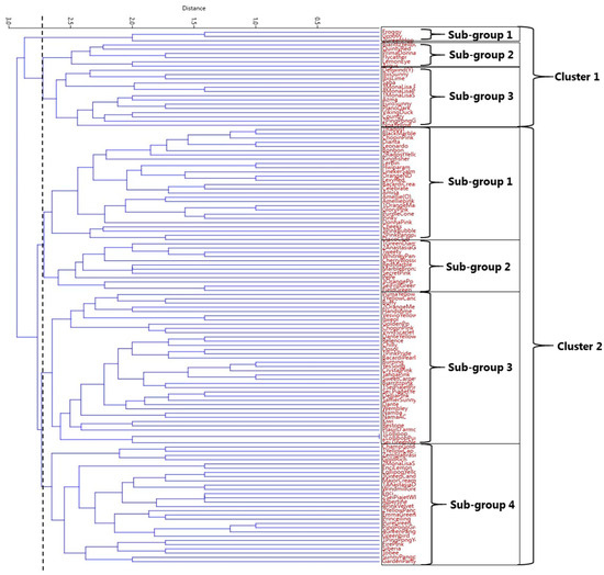 The genetic relationships among the 126 spray-type chrysanthemum cultivars were evaluated by constructing a dendrogram based on the molecular profiles produced by the six SSR markers. A UPGMA cluster analysis was performed based on the Euclidean genetic distance values to construct a dendrogram. The Euclidean distance coefficient ranged from 0.10 to 3.00 across all the SSR markers. The dendrogram grouped all 126 cultivars into two major clusters, and at a distance of 2.75, cultivars were grouped into three and four subgroups in Cluster 1 and Cluster 2, respectively (Figure 3).