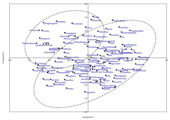Certain cultivar groups showed close genetic relationships within clusters. For instance, two yellow decorative-type cultivars from the Ibis series, Ibis Sunny and Ibis Lime, grouped closely in sub-group 3. Similarly, three anemone-type Mona Lisa cultivars with pink, purple, and yellow flowers clustered together in sub-group 3. However, Mona Lisa Splendid, another cultivar in this series with yellow anemone-type flowers, was positioned distantly in sub-group 4, suggesting a different genetic background despite similar floral characteristics. Other examples include pink and yellow pompon cultivars Sei Piaget Pink and Sei Piaget Yellow, and the purple Namba and Namba AC cultivars with anemone and single flower types grouped in sub-group 3 of Cluster 2. Purple pompon cultivars Lollipop and Lollipop Purple showed a very close genetic relationship, indicating a shared genetic background. The Principal Component Analysis (PCA) of the SSR data supported the dendrogram findings, with cultivar groupings in the PCA plot aligning with the UPGMA cluster analysis (Figure 4).