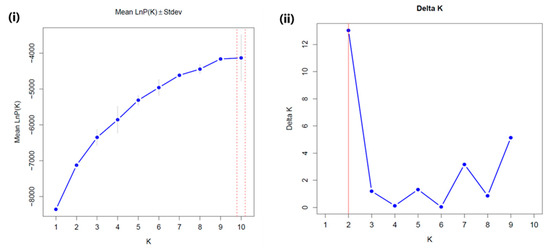 Graphical illustration of the assessment of the best subpopulation numbers according to the appropriate K value. (i) Mean of ∆K values representing 15 independent runs with K = 1 to K = 10 based on LnP(K) values. (ii) The mean of ∆K showed a peak at K = 2.