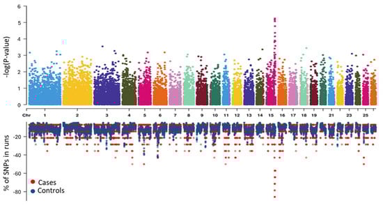 Miami plot illustrating the comparison of the GWAS (top) and percentage of SNPs in runs of homozygosity (ROH) (bottom) analyses of dozer lamb cases and unaffected control sheep.