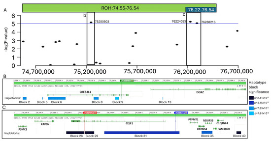The region of significance on chromosome 15, the significant results identified by the GWAS and ROH analyses, and the significant haplotype blocks are identified from fine mapping. (A). The significant GWAS results on chromosome 15 with the location of the ROH are identified in the green bar, and the subset of the ROH is indicated with the blue bar. The black framed boxes (b) and (c) show the locations of the regions of interest in relation to the GWAS and ROH results. (B). Region of interest 1: 50 kb on either side of the SNP rs407879401 with the boxes identifying the significant haploblocks in the region of interest in relation to the genes and significant SNP. (C). Region of interest 2: the 164 kb surrounding SNPs rs628219689 and rs608876284 with the boxes identifying the significant haploblocks in the region of interest in relation to the genes and significant SNP.