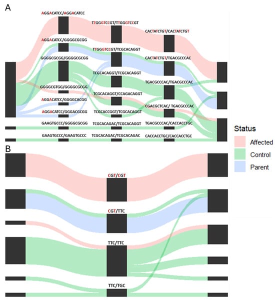 Diplotype distribution for (A). haploblock 28 and (B). haploblock 29 for the affected, control, and parental samples. The black boxes show the segments present in each haploblock, and the SNPs in red are SNPs present only in the affected haplotype.