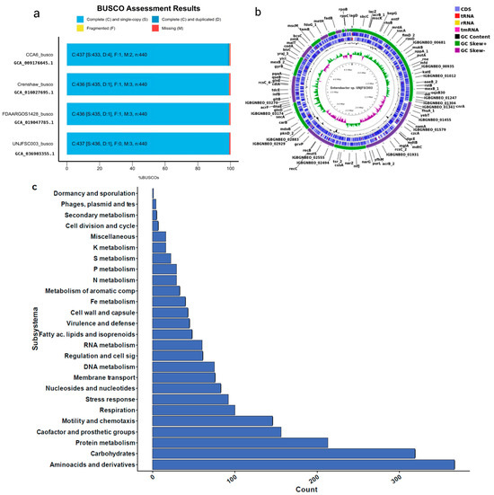 Genomic results of Enterobacter sp. (a) Comparison of BUSCO analysis between UNJFSC003 and the strains CCA6, Crenshaw, and FDAARGOS1428. (b) Genomic map of Enterobacter sp. UNJFSC003. (c) Subsystem distribution in UNJFSC003.