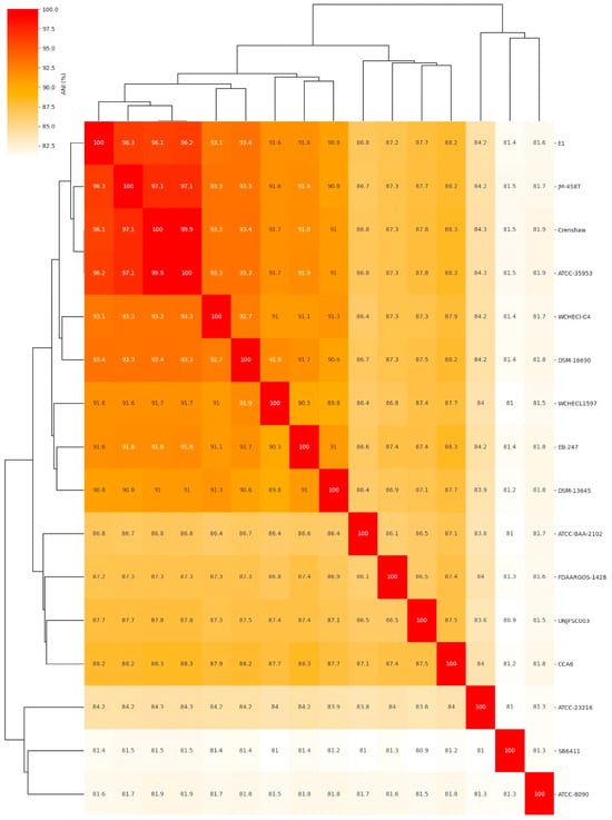 - Shimoyama, Y. ANIclustermap: A Tool for Drawing ANI Clustermap Between All-vs-All Microbial Genomes. 2022. Available online: https://github.com/moshi4/ANIclustermap (accessed on 31 October 2024).