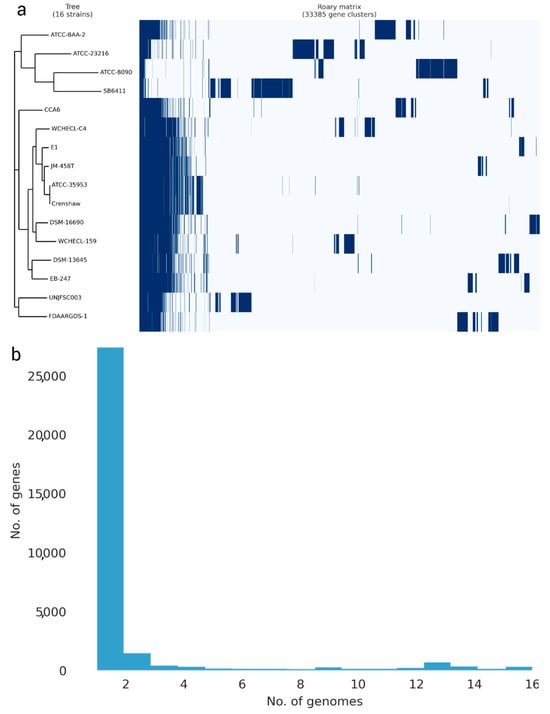 The pangenome of 16 Enterobacter strains was determined using the Roary matrix. A total of 33,385 orthologous protein-coding genes were found. (a) Heatmap showing the presence (dark blue) or absence (light blue) of genes in each of the 16 strains. A phylogeny constructed based on core genes (left) and genome strain names (right). (b) Histogram showing the distribution of genomes per gene.