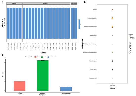 Prediction of enzymes in hydrocarbon degradation by the HADEG database. (a) Heatmap of all 21 enzymes of UNJFSC003 involved in the degradation of hydrocarbons, including alkanes, aromatics, and biosurfactants. (b) Bubble chart showing the distribution of sub-pathways of the HADEG-validated enzymes. (c) Histogram displaying the number of enzymes for each type of hydrocarbon and biosurfactant.