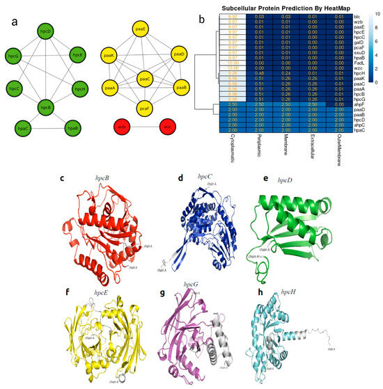 (a) Heat map showing the subcellular localization of the 21 enzymes. (b) Predicted network interactions of proteins involved in hydrocarbon degradation, with protein clusters marked in green (hpc and hpa), yellow (paa and pca), and red representing the two biosurfactant proteins. (c) Model of hpcB. (d) Model of hpcC. (e) Model of hpcD. (f) Model of hpcE. (g) Model of hpcG. (h) Model of hpcH.