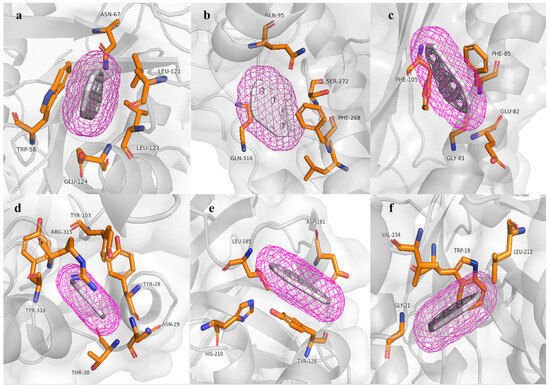 Results of molecular docking with the HAP (benzo[a]pyrene) molecule. (a) Active site amino acids of hpcB. (b) Active site amino acids of hpcC. (c) Active site amino acids of hpcD. (d) Active site amino acids of hpcE. (e) Active site amino acids of hpcG. (f) Active site amino acids of hpcH.