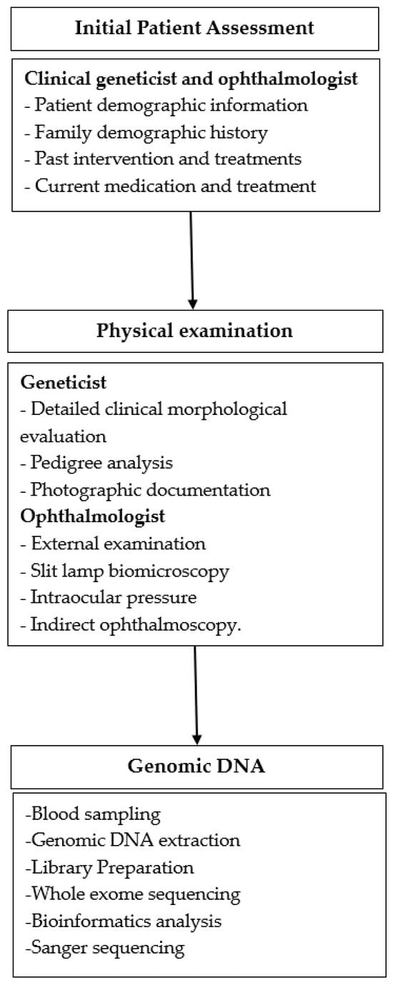 An ophthalmic examination was conducted by an ophthalmologist using slit-lamp biomicroscopy, intraocular pressure (IOP) measurement, and indirect ophthalmoscopy for all individuals. Photographic documentation of external ocular features and facial characteristics was also completed. A clinical geneticist performed a genetic evaluation, which included a review of family history, pedigree analysis, and any relevant systemic findings. The history of congenital TORCH infections (toxoplasmosis, rubella, cytomegalovirus, herpes simplex, syphilis, varicella zoster, and Zika), as well as the use of corticosteroids and ocular trauma, were ruled out.