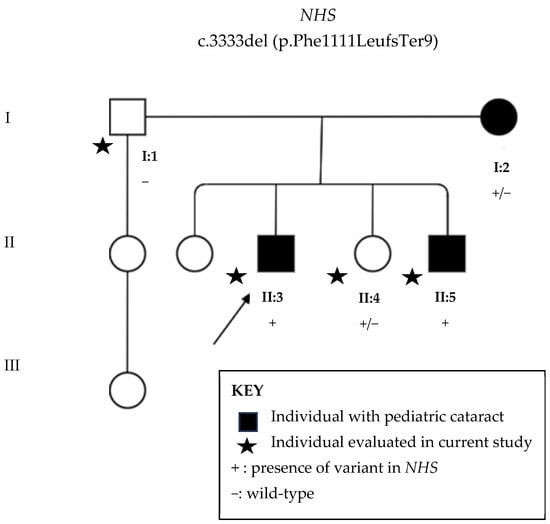 Family pedigree with three generations depicted. Circles indicate women and squares men. Black circles and squares indicate individuals with pediatric cataracts. Stars indicate family members evaluated in the current study. +: presence of variant c.3333del (p.Phe1111Leufs*9) in NHS gene located in X chromosome, −: wild type.