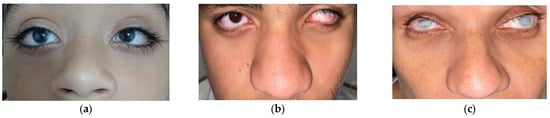The mother (Figure 2, individual I:2), aged 45 years, was diagnosed with congenital cataracts at 1 month old and underwent surgery at 4. Currently, she has total bilateral corneal opacities (Figure 3c), with both the anterior chamber and fundoscopy being unobservable. IOP was normal.
