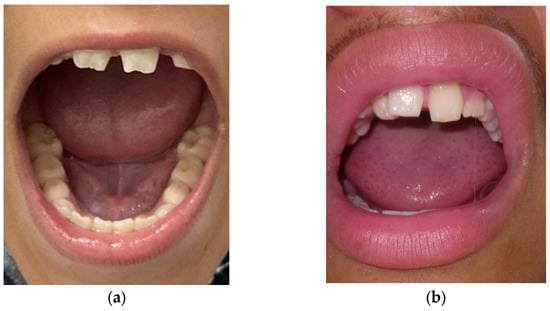 Teeth alterations in Nance–Horan syndrome: (a) Screwdriver-shaped incisors and diastema in individual II:3; (b) screwdriver-shaped lateral incisors and diastema in individual II:5.