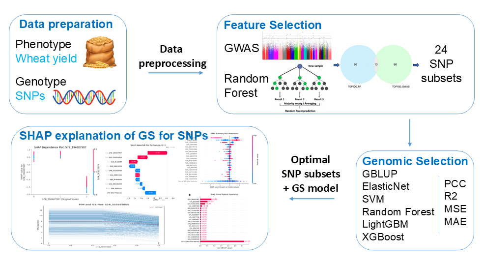 This study systematically addresses improving wheat GS prediction accuracy via a novel framework, GRE, i.e., joint feature screening with GWAS and RF for dimensionality reduction, by utilizing six GS algorithms to integrate linear and non-linear model advantages. Furthermore, the interpretability technology of the SHAP series of models is used to accurately analyze the complex quantitative relationship between wheat yield phenotypes and genotypes at the micro-level of the overall macro-view, the main and interaction effects of SNPs, and the average and individual effects of SNPs, further enriching the interpretability difficulties of the “black box” of machine learning and deep learning models in the GS field, and providing strong support for the continuous improvement and enhancement of GS models. The propsed framework, GRE, in this study will contribute to the screening of significant SNPs for important traits in wheat and other typical economic plants and animals. Furthermore, it also provides technical support for the design and development of intelligent breeding chips, especially for improving the yield of plants and animals worldwide and the sustainable development of agriculture.