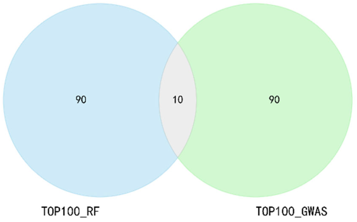 The intersection rate of the TOP subsets of GWAS and RF (10/100, 17/200, 43/500, 120/1000, 383/2000, 821/3000) is approximately 9–27%, and the number of markers in the union subset (190/100, 393/200, 957/500, 1880/1000, 3617/2000, 5179/3000) is 1.73–1.97 times that of the corresponding TOP subset, thereby retaining more potentially associated markers. Taking the TOP 100 of GWAS and RF as an example (Figure 2), the intersection subset contains 10 SNPs, and the union is 190 SNPs. The number of SNPs in all intersection and union subsets is shown in the Supplementary Table S2.