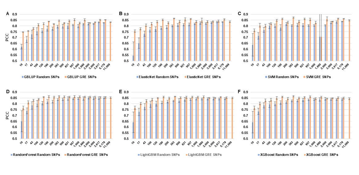 Figure 3. The comparisons of PCC between randomly selected SNPs and GRE SNPs for six GS models on subsets of different SNP dimensions. The height of the bar chart represents the mean of the PCC of repeated tests, and the error bars represent the standard deviation. The last bar in each sub-plot is the calculation result of all 11,089 SNPs, which serves as a reference. (A) GBLUP model. (B) ElasticNet model. (C) SVM model. (D) Random forest model. (E) LightGBM model. (F) XGBoost model.
