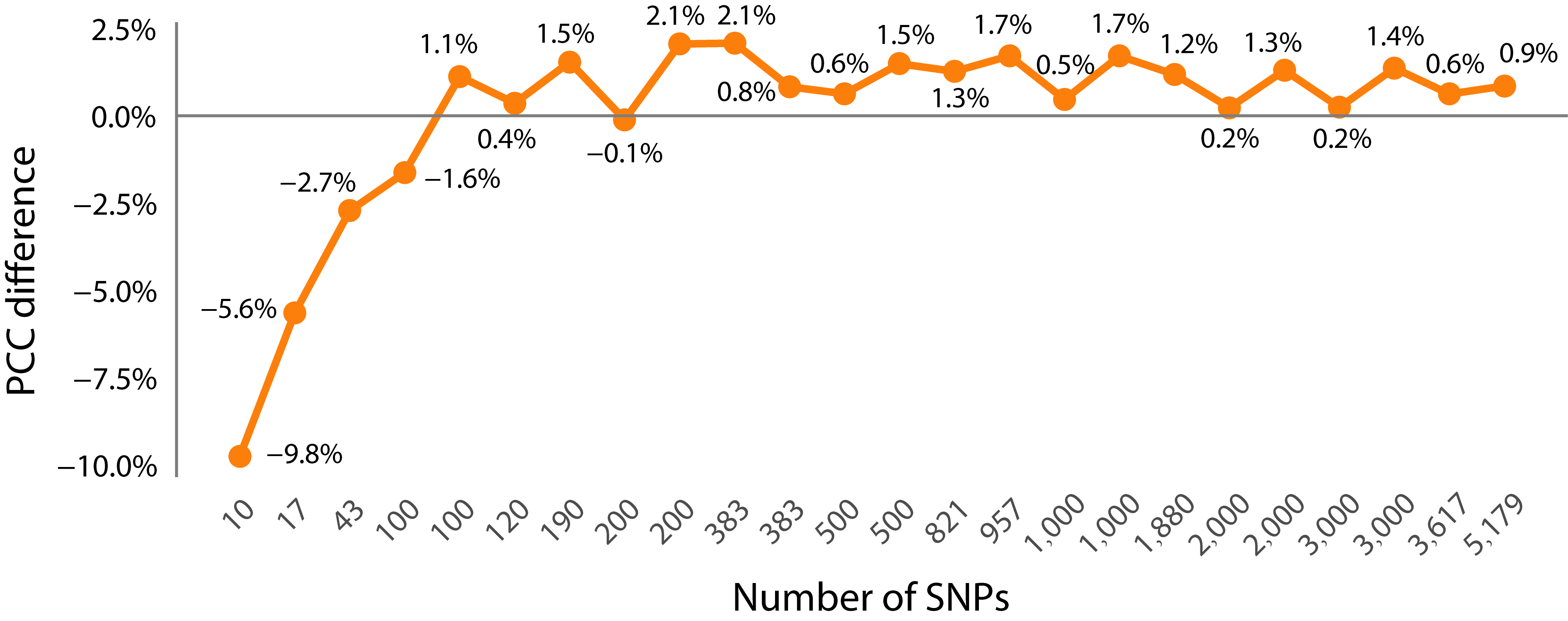 Figure 4. The difference between the average predicted PCC of the GS model under different SNP dimensions and the prediction using all 11,089 SNPs.