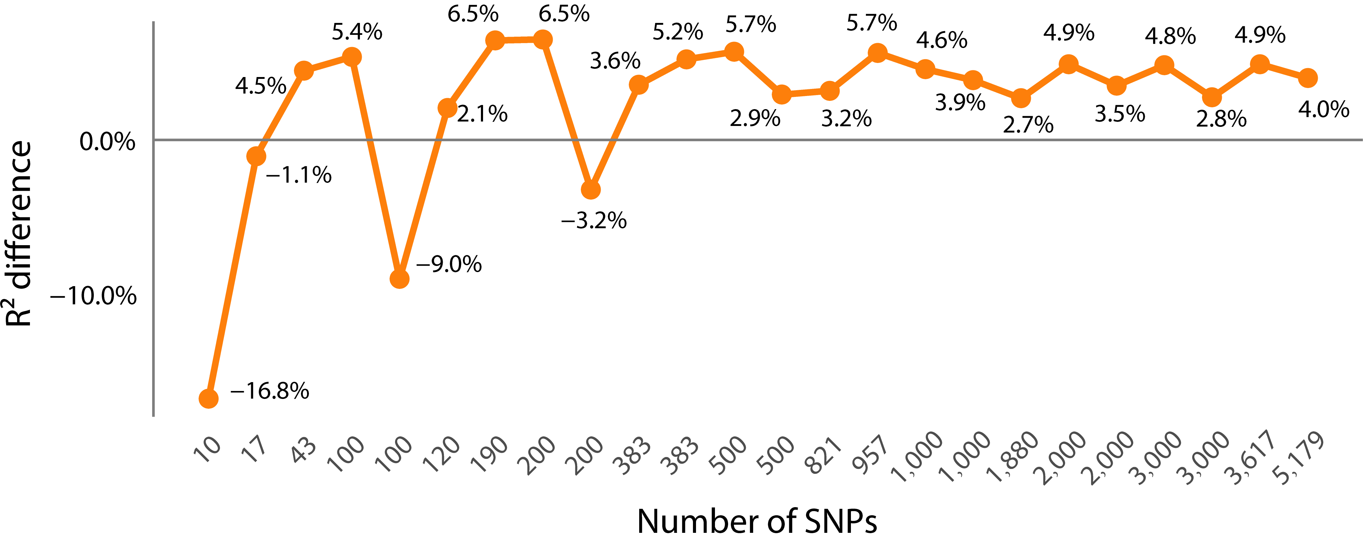 Figure 5. The difference between the average predicted R2 of the GS model under different SNP dimensions and the prediction using all 11,089 SNPs (GBLUP and SVM are unstable and not included in the calculation).