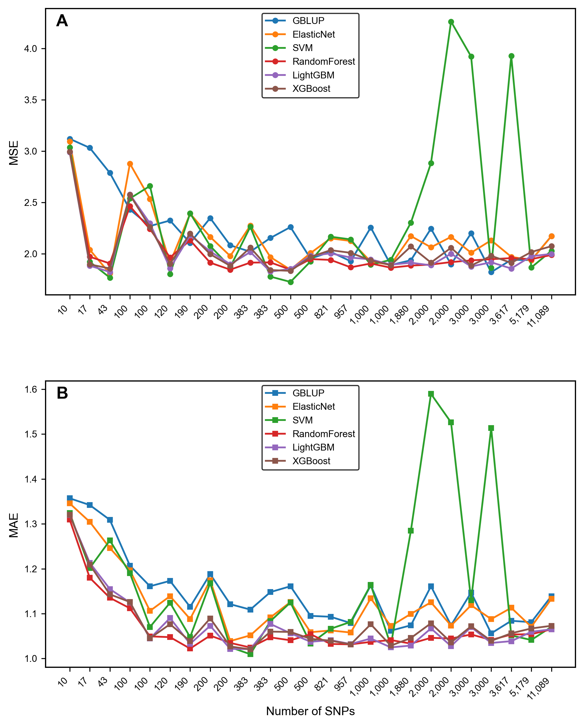 Figure 6. MSEs and MAEs of GS models on different SNP subsets. (A) MSEs of six GS models. (B) MAEs of six GS models.