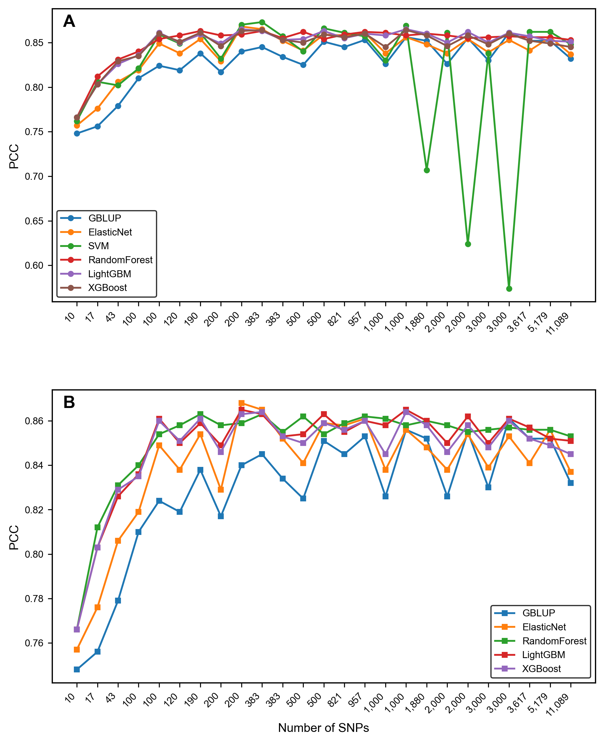 In terms of prediction accuracy, random forest and LightGBM performed best on most subsets (average PCC = 0.849–0.851) (Figure 7B, Supplementary Table S3), followed by XGBoost (average PCC = 0.847) and ElasticNet (average PCC = 0.84). These four machine learning models were significantly higher than GBLUP (average PCC = 0.829). Among the machine learning models, SVM generally performed better on small subsets (<1000 SNPs), but was the most unstable on large subsets (>1000 SNPs) (Figure 7A).