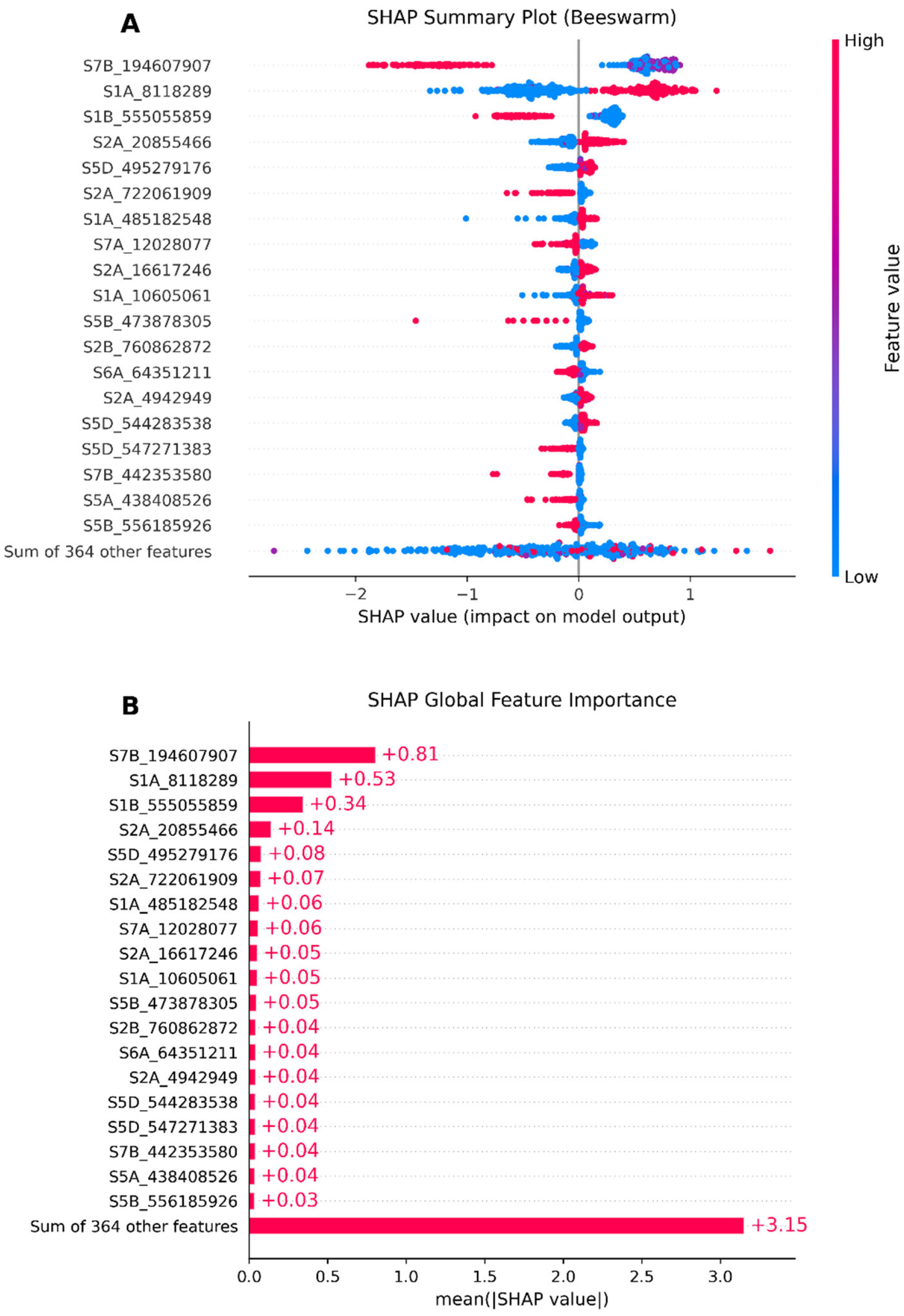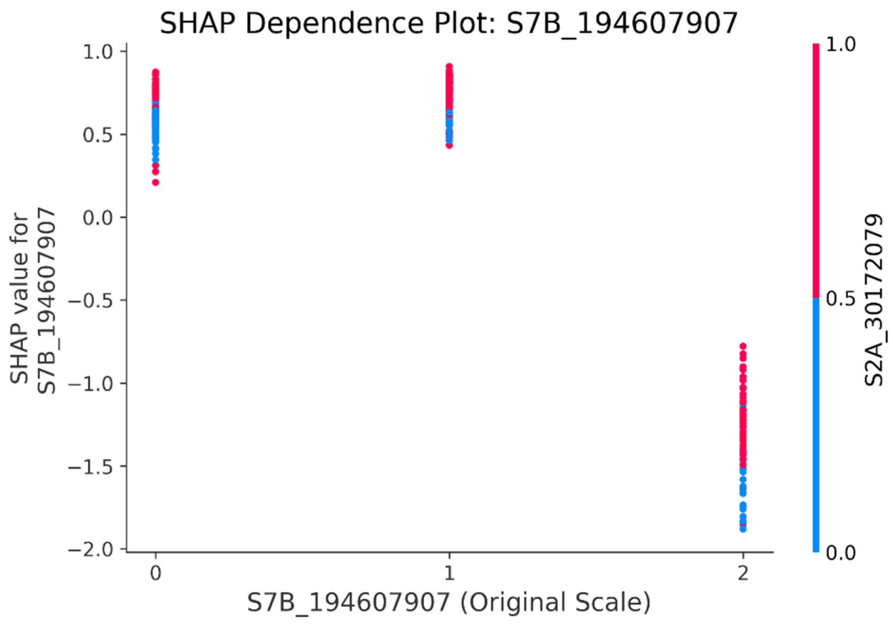 Second, the complex interactions among significant SNP features are revealed through the dependence plot. The dependence plot (Figure 9) shows how the value of a single SNP (the main effect), for example, SNP S7B_194607907, affects its own SHAP value, and can also reveal its interaction effect with other features (such as SNP S2A_30172079 in Figure 9) through color. There is a clear vertical color separation in the figure (for example, the upper part is mainly red dots, and the lower part is mainly blue dots), indicating that the effect of the main SNP S7B_194607907 may be strongly influenced by the interacting feature SNP S2A_30172079.